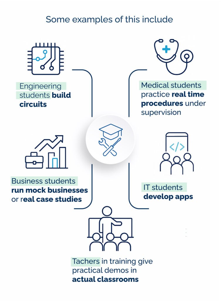 Hands-on-learning refers to learning by doing and to enabling students to actively engage in practical activities instead of simply reading and listening to theory or to engaging in route-learning.  Students are encouraged to perform experiments and simulate scenarios or work on projects and apply their learnings to practice.