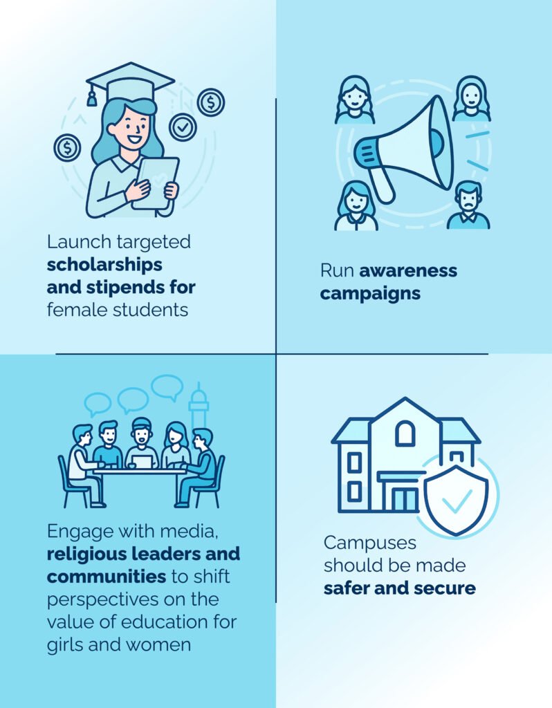 Some methods to improve girls’ and women’s access is to launch targeted scholarships and stipends for female students, run awareness campaigns, and engage with media, religious leaders and communities to shift perspectives on the value of education for girls and women. Campuses should be made safer and secure in line with the needs of female students, especially in remote regions, to curb concerns for security by family and community members.