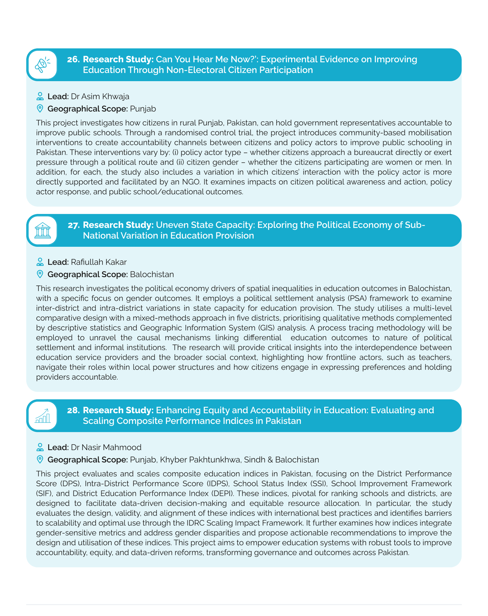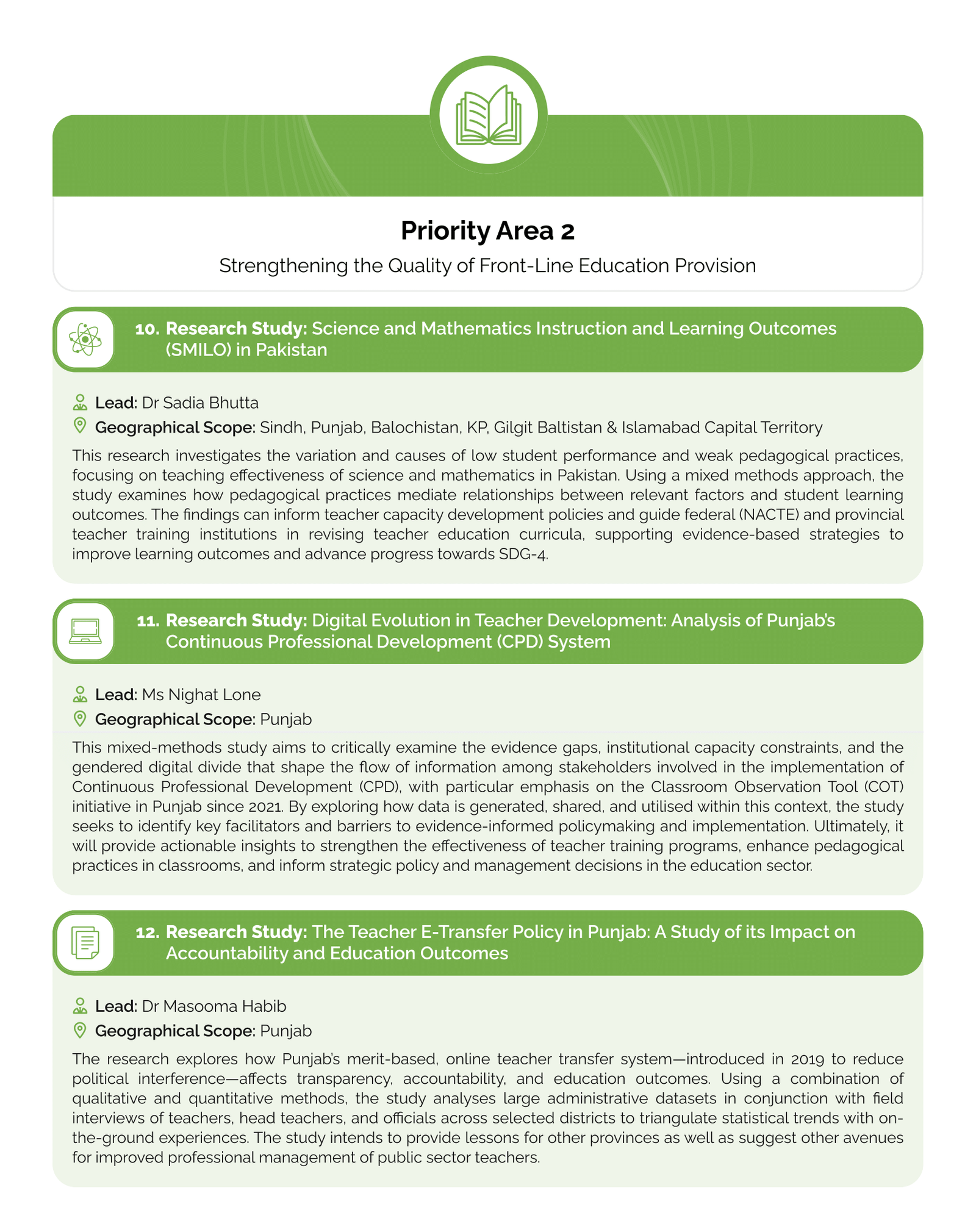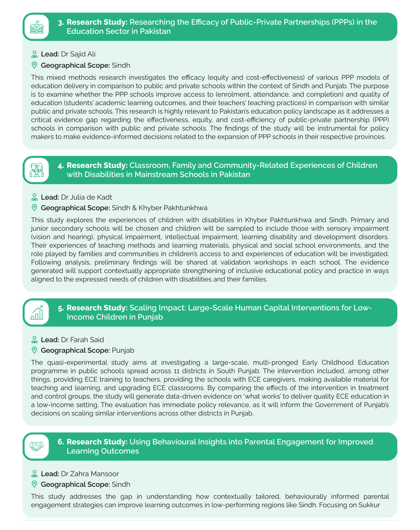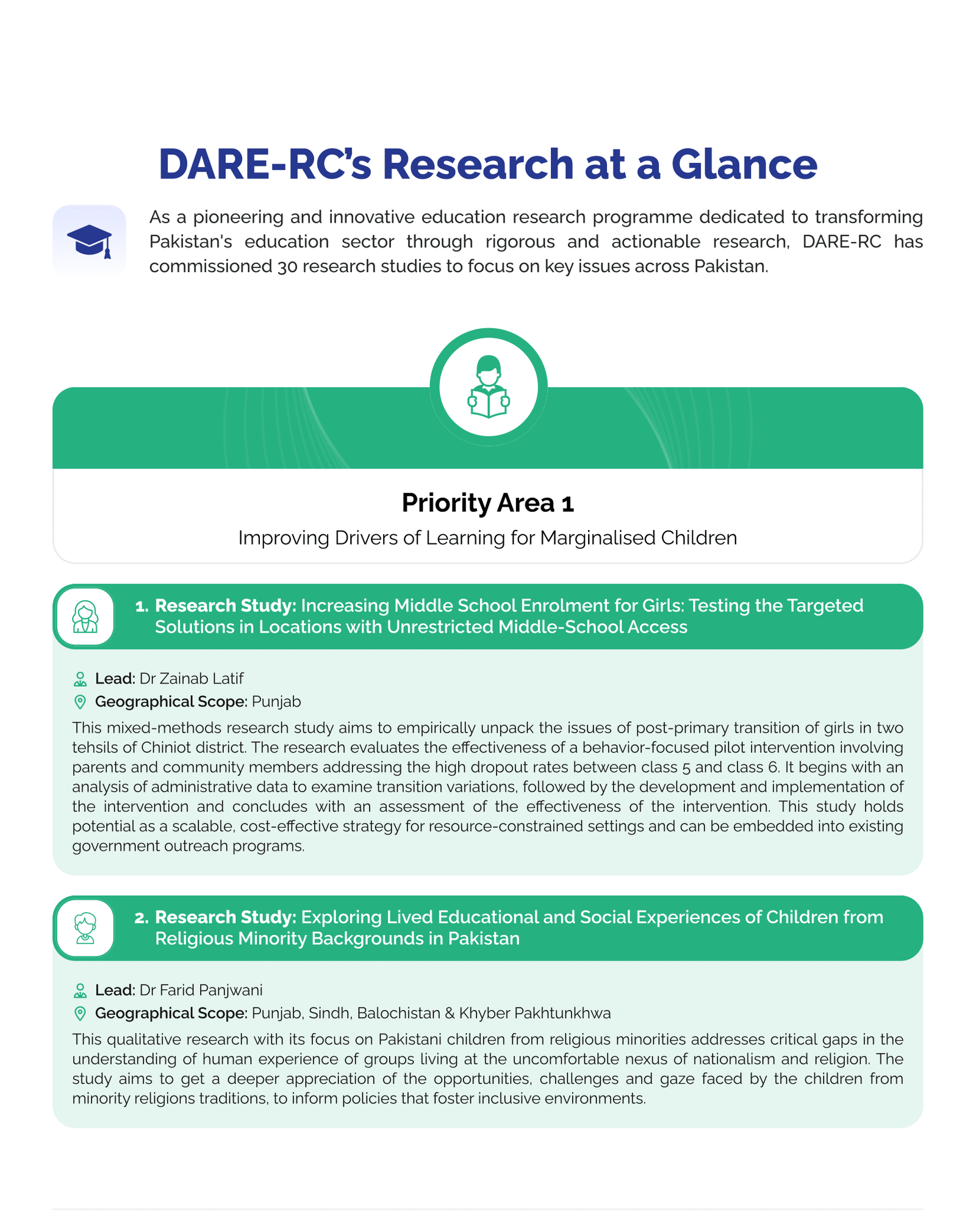 1) Develop a rigorous body of timely and accessible evidence on the key issues within education service delivery in Pakistan – including getting more girls into school, studying for longer and learning better, improving teaching quality, increasing accountability, reaching out to marginalised girls and boys such as those with disabilities and from minorities and the use of technology in education,