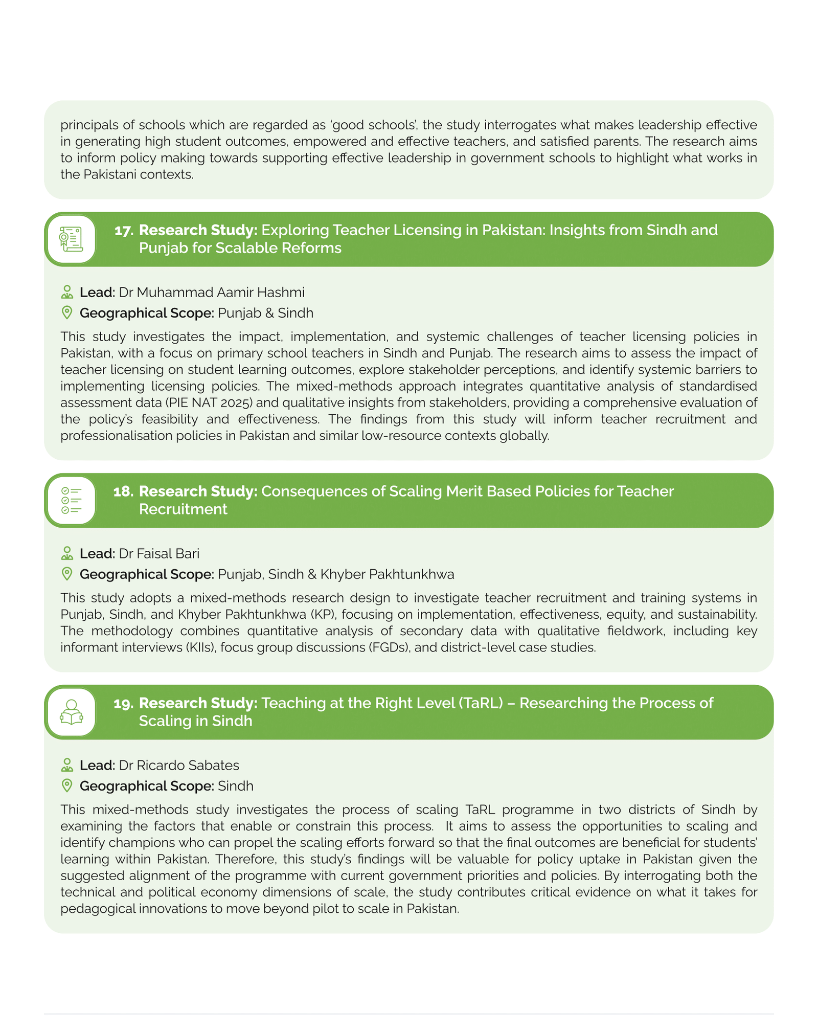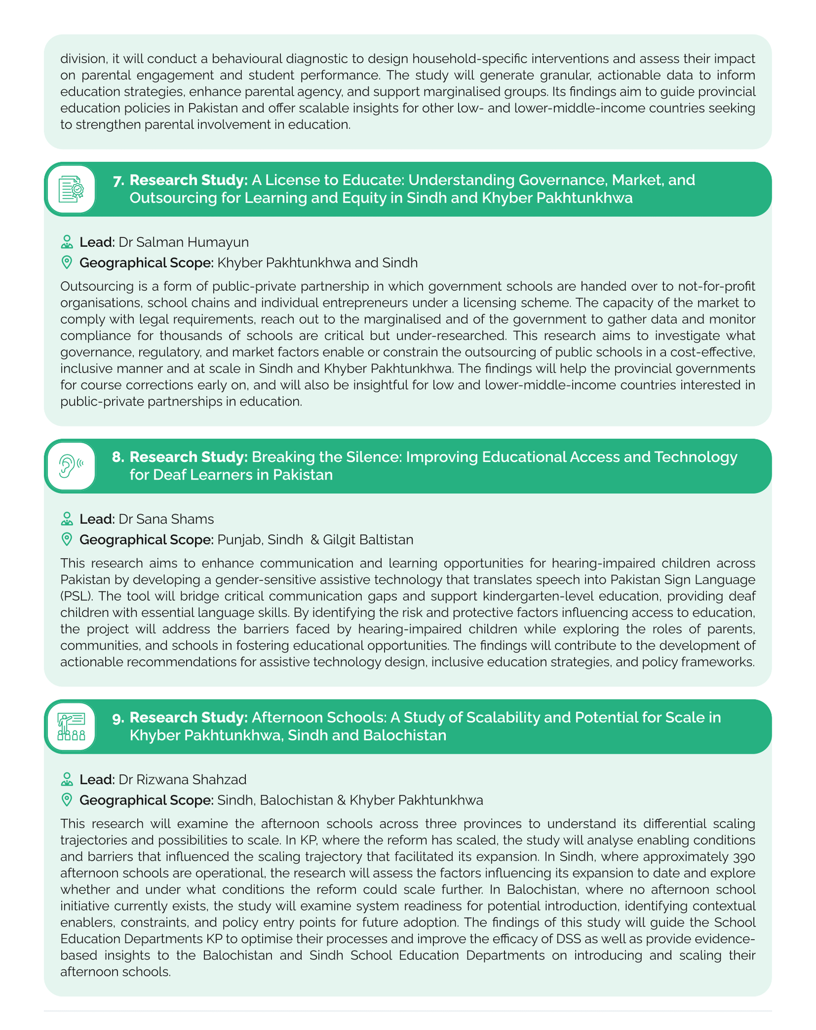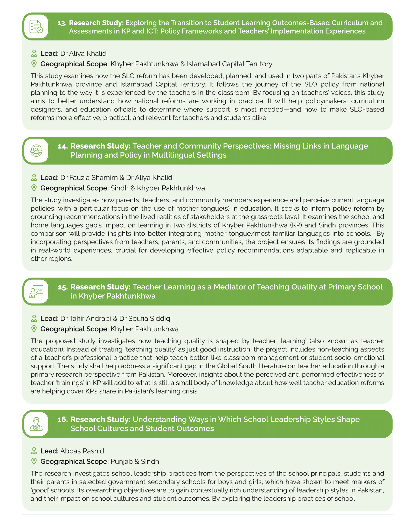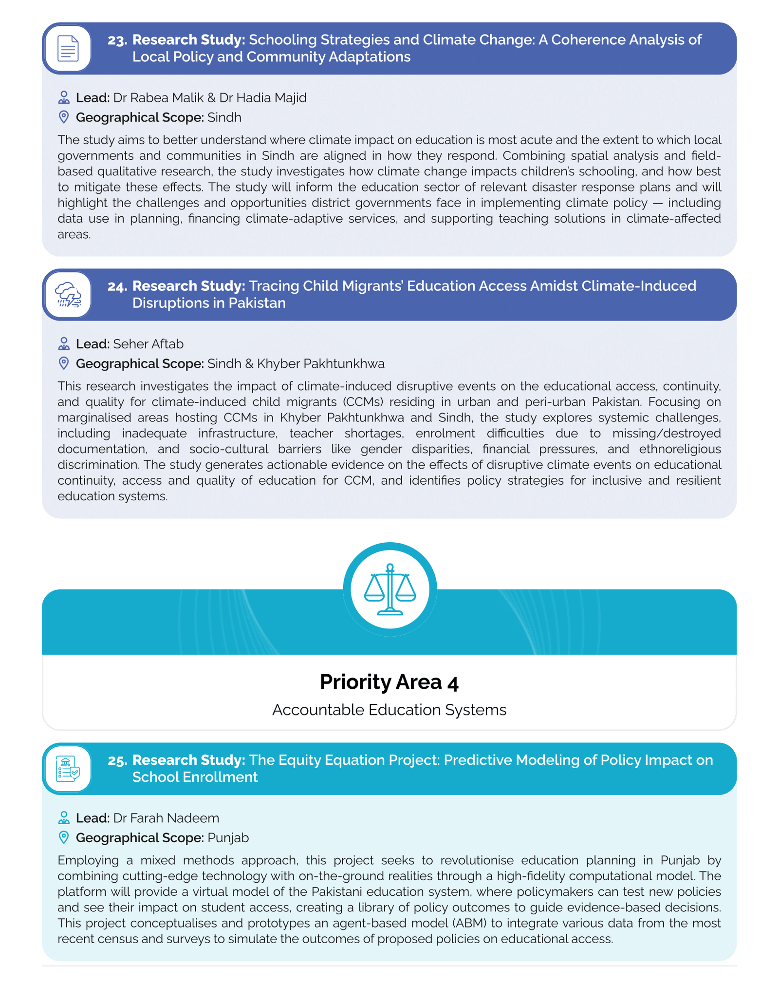 1) Develop a rigorous body of timely and accessible evidence on the key issues within education service delivery in Pakistan – including getting more girls into school, studying for longer and learning better, improving teaching quality, increasing accountability, reaching out to marginalised girls and boys such as those with disabilities and from minorities and the use of technology in education,