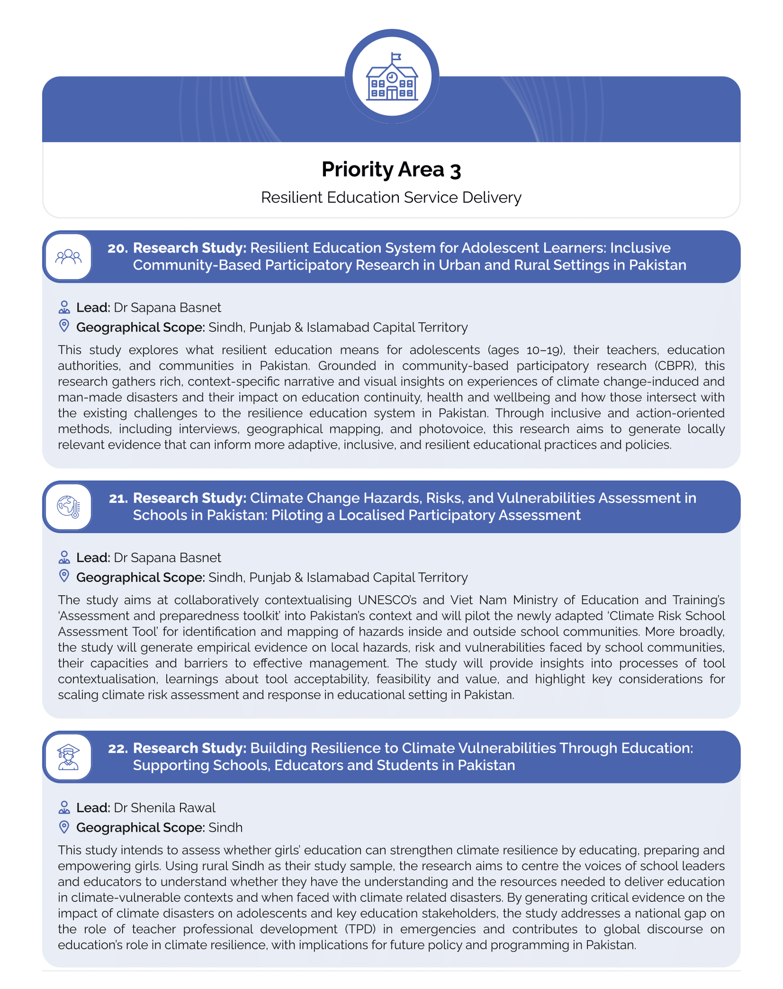 This mixed methods study aims to investigate what resilient education systems mean to adolescent learners, their teachers, education authorities and communities in Pakistan, using Punjab, SIndh & ICT as study samples. Understanding these contextual experiences and how they are mediated through barriers and vulnerabilities related to climate change can directly feed into the policy and programmes related to localised resilient education systems.